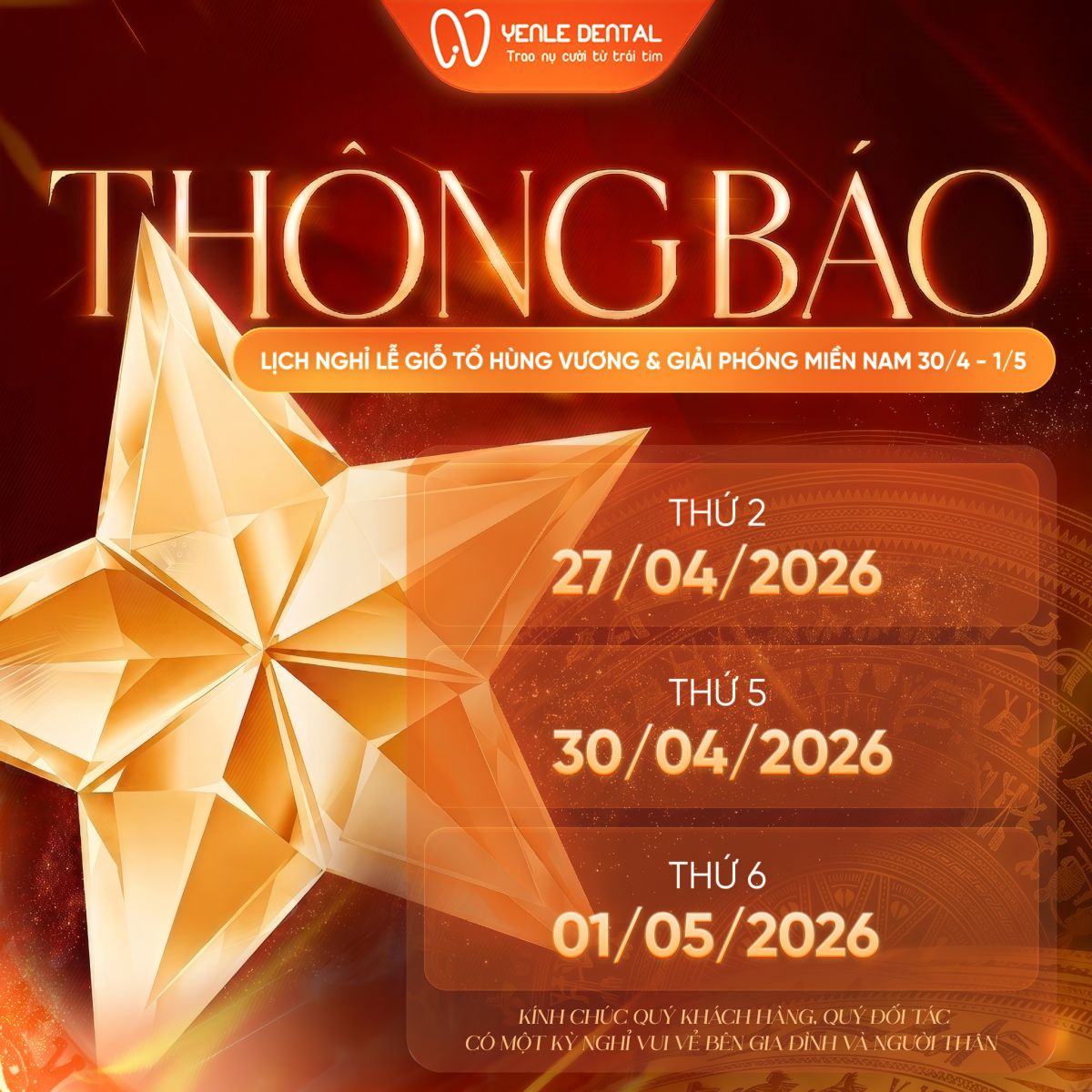 Hòa chung không khí hân hoan chào đón các ngày lễ lớn của đất nước, Nha khoa Yenle Dental xin trân trọng thông báo đến Quý khách hàng lịch nghỉ lễ Giỗ Tổ Hùng Vương và Đại lễ Giải phóng miền Nam 30/4 - Quốc tế Lao động 1/5 năm 2026 cụ thể như sau: